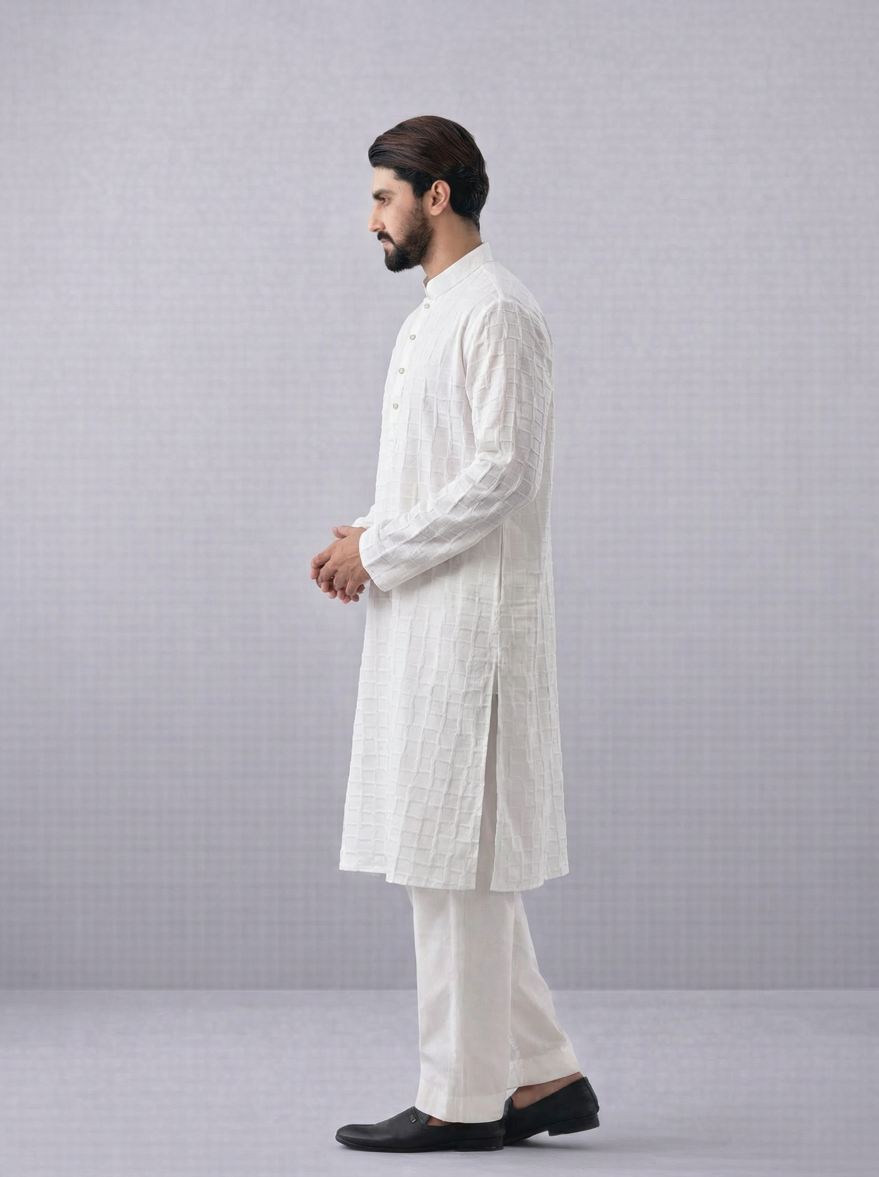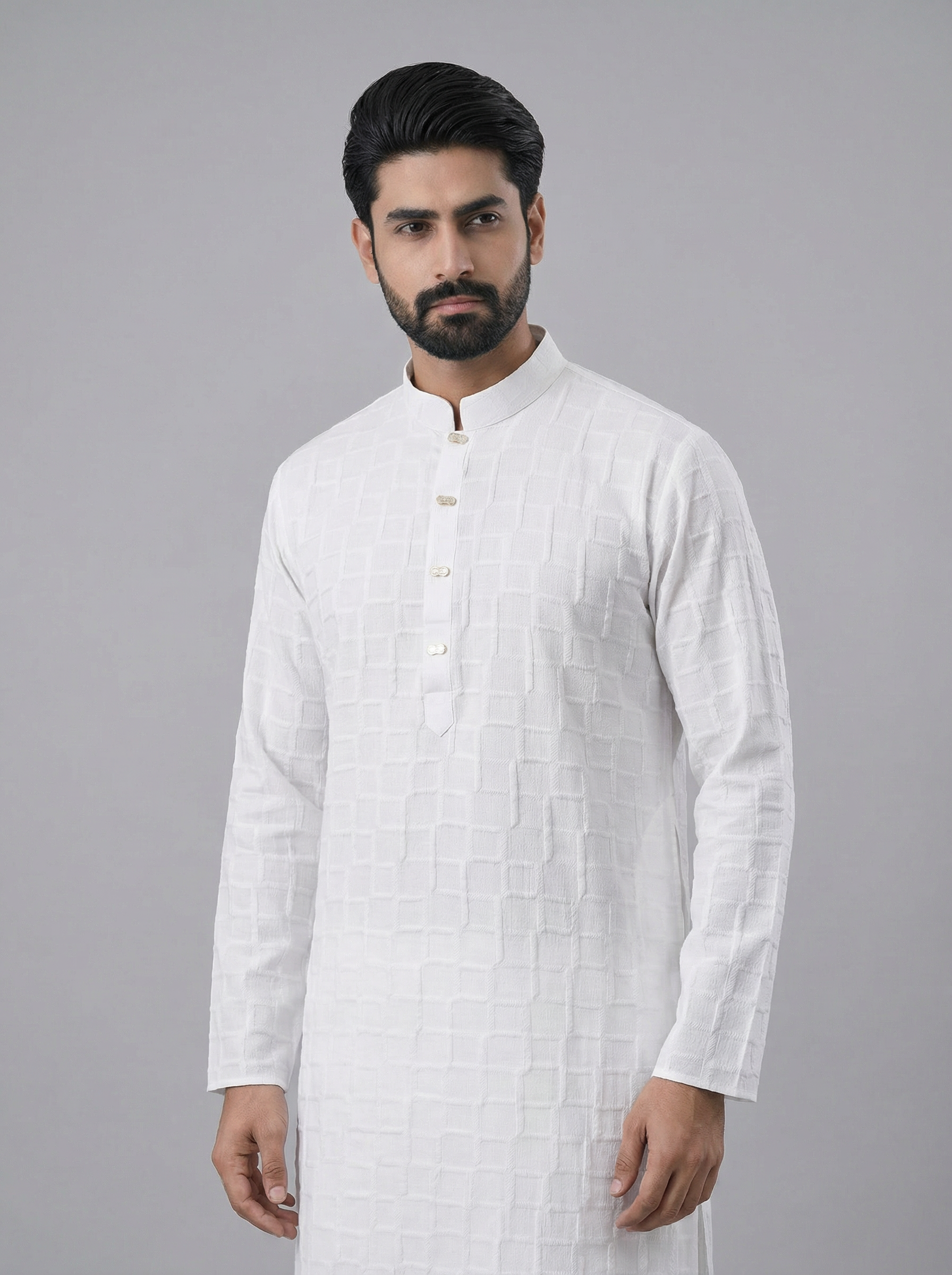 সুন্দর স্কয়ার টেক্সচার ডিজাইন ও মিনিমাল বোতাম ডিটেইলিং পাঞ্জাবিটিকে দিয়েছে একটি প্রিমিয়াম ও রাজকীয় লুক। নামাজ, ঈদের জামাত, পারিবারিক দাওয়াত কিংবা যেকোনো উৎসব উপলক্ষে এটি হতে পারে আপনার পারফেক্ট চয়েস।